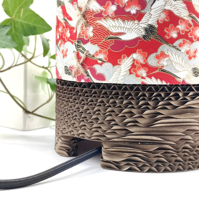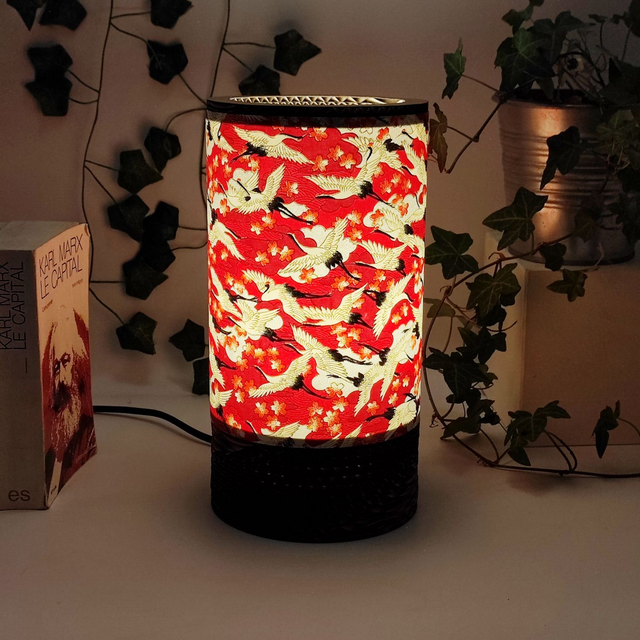 Apportez une touche d’élégance et d’originalité à votre décoration avec ce luminaire en carton surcyclé, conçu à la main et sublimé par un papier japonais orné de grues et de fleurs de cerisier, symbole de bonheur et de renouveau. Son design cylindrique et son ouverture sur le haut permettent une diffusion douce et chaleureuse de la lumière, idéale pour un salon, une chambre ou un bureau. Une feuille de polyphane protège le papier décoratif de l’ampoule garantissant durabilité et sécurité.
