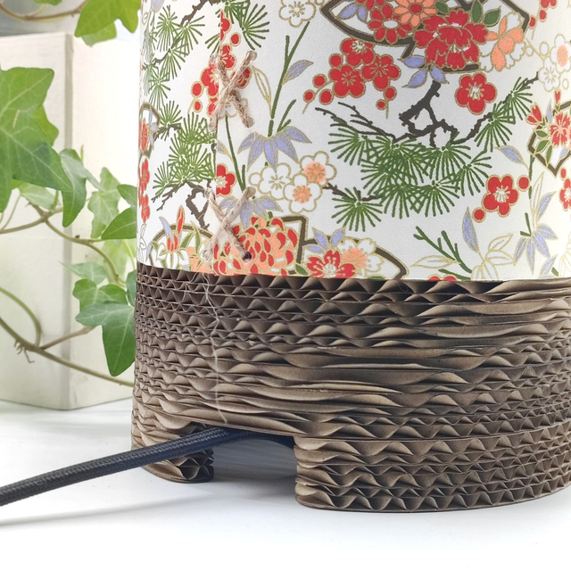 Apportez une touche d’élégance et d’originalité à votre décoration avec ce luminaire en carton surcyclé, conçu à la main et sublimé par un papier japonais raffiné, orné de motifs végétaux et floraux mêlant pins, bambous et pruniers, symbole de force, d'espoir et de renouveau. Son design cylindrique et son ouverture sur le haut permettent une diffusion douce et chaleureuse de la lumière, idéale pour un salon, une chambre ou un bureau. Une feuille de polyphane protège le papier décoratif de l’ampoule garantissant durabilité et sécurité.